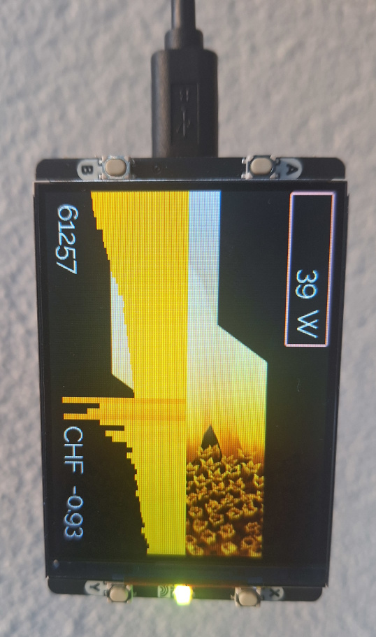 Die Anzeige wird per USB mit Energie versorgt, ein USB-Netzteil kann ich bei Bedarf mitliefern. Der Mikrocontroller inklusive Display verbraucht weniger als 0.5 W.